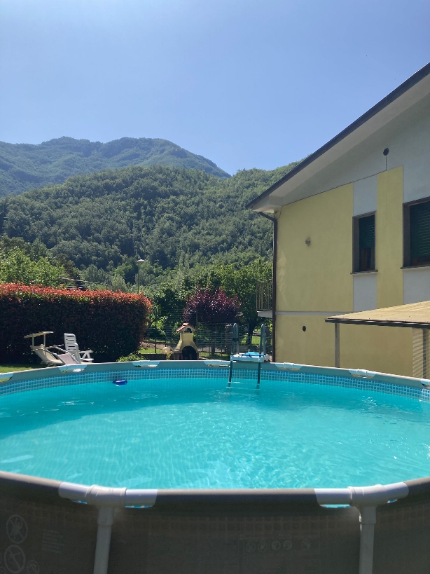Vacker villa med pool på två våningar till salu i Bagni di Lucca, Den stora trädgården med inhägnad omger huset, med pool, grill, privat tillgång och stor täckt parkeringsplats. Tillgång till övervåningen också genom extern trappa. Fönsterbågar i kastanje med tvåglas isolerglasfönster med jalusier