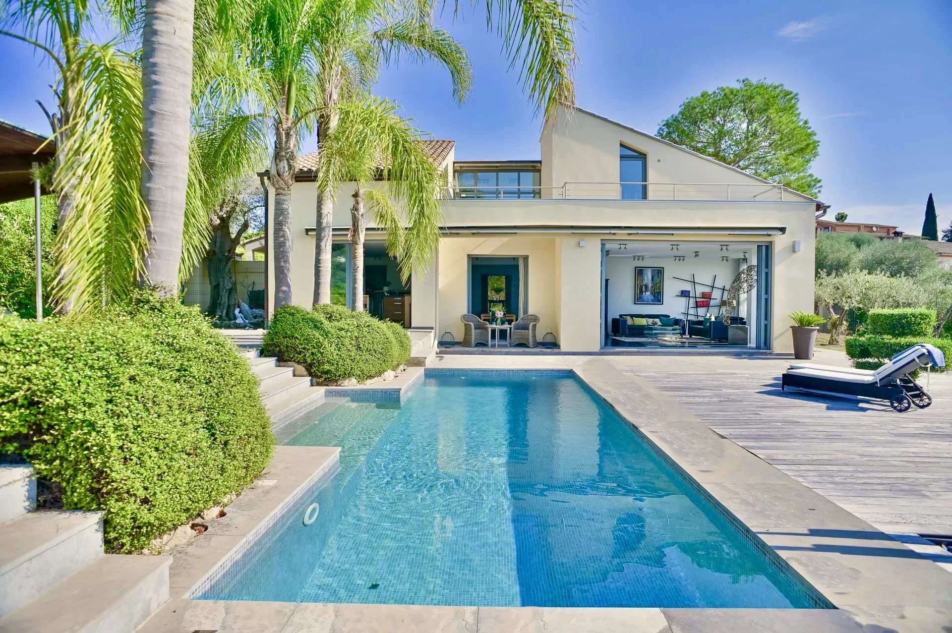BIOT LANDSBY - MELLAN NICE OCH CANNES – Fantastisk fastighet med 4 sovrum, pool, tomt på 2013 m² och havsutsikt. Exklusiv - Vi har nöjet att presentera en exceptionell fastighet endast 500 meter från den charmiga medeltidsbyn Biots, belägen i ett lugnt och mycket eftertraktat bostadsområde. Den