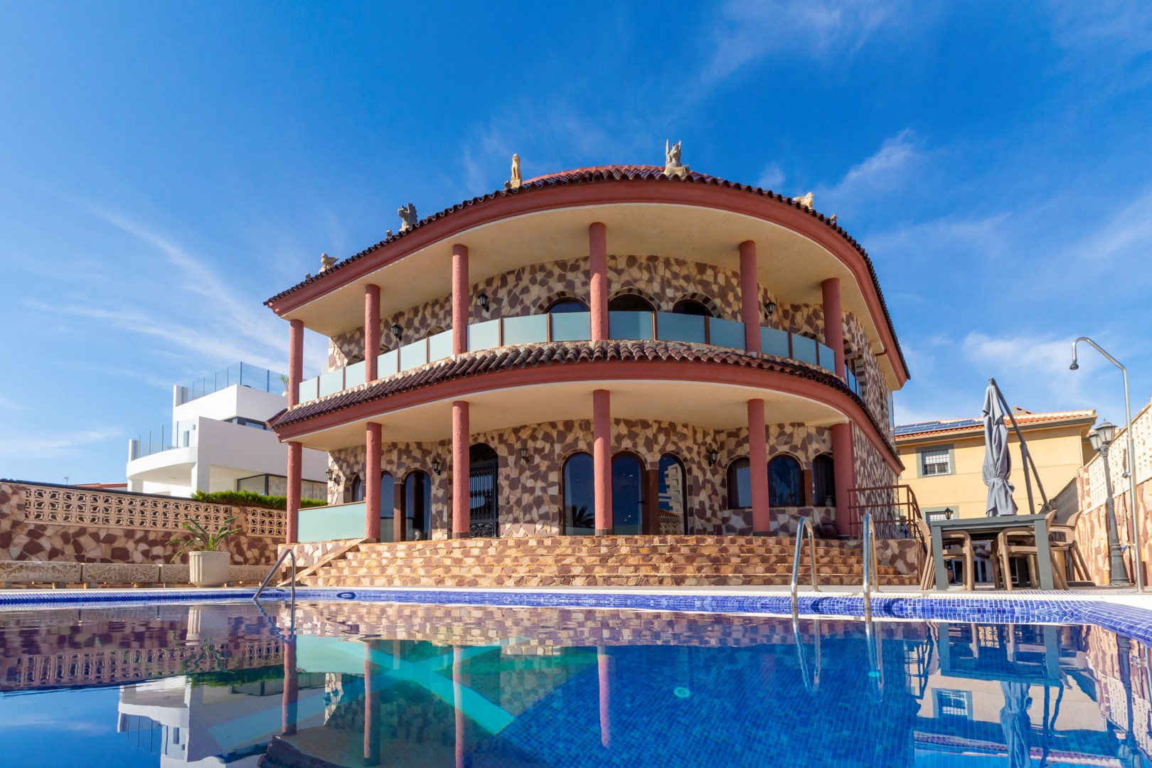 Varmt välkomna till denna spektakulära villa i La Zenia! Belägen mindre än 100 m från stranden och strandpromenaden som sträcker sig längs kusten! Villan erbjuder generösa och öppna ytor med 4 sovrum och 6 badrum som disponeras över två plan. Det första du möts av är den välskötta trädgården som