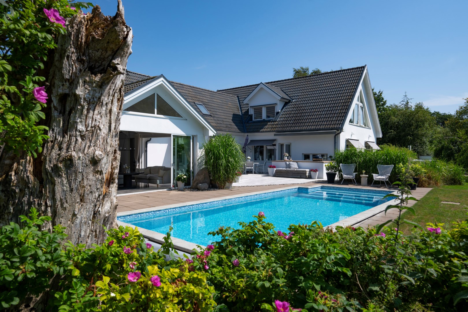 SKARPT LÄGE MED SEMESTERKÄNSLA ÅRET RUNT Sista tomten innan sanddynerna tar vid, där havet möter land i en oändlig horisont, står detta ståtliga robusta hus byggt 2001 med påkostade materialval genomgående i sober tidlös färgsättning som aldrig går ur tiden. Ett hem att samla familj och vänner