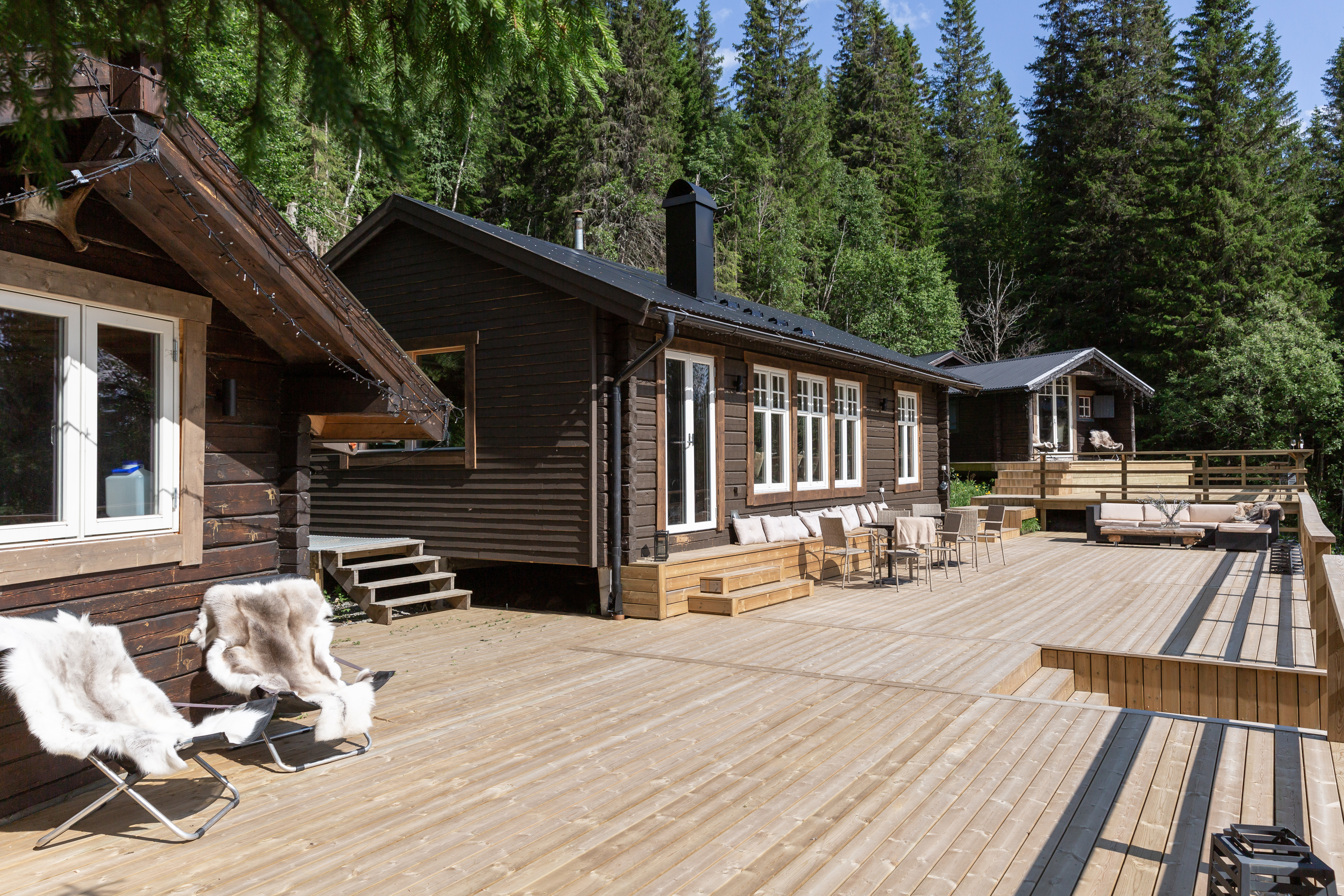 Välkommen till en fastighet med tre timrade byggnader som är något långt utöver det vanliga. Här har ägarna skapat ett hem som har det mesta och som kronan på verket finns en stor terrass i bästa söderläge som på ett smakfullt sätt bygger ihop de olika byggnaderna. Den sammanlagda levnadsytan på ca