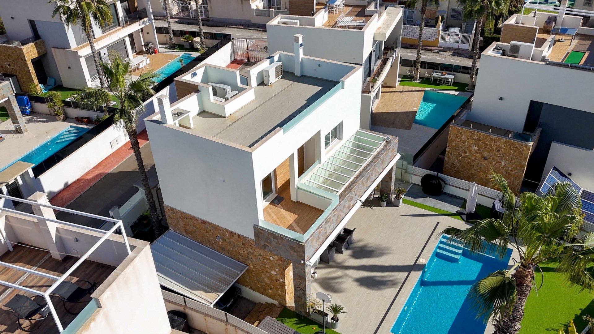 Med stor glädje presenterar vi denna imponerande villa belägen i attraktiva Torre del Moro! Här erbjuds ett modernt och exklusivt boende där högkvalitativa materialval kombineras med genomtänkta detaljer för att skapa en elegant och komfortabel livsstil. Villan ligger på en generös tomt i soligt