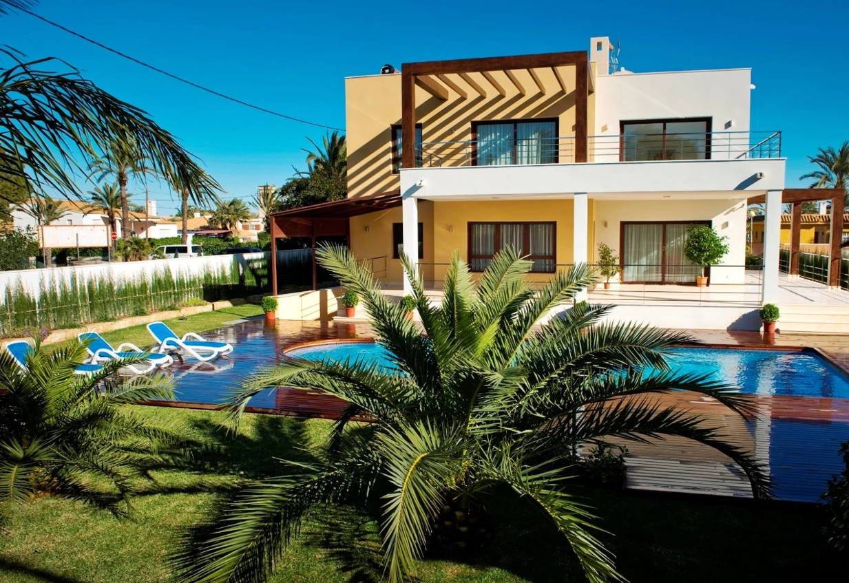 Nu presenterar vi denna exceptionella villa, belägen i ett av de mest exklusiva områdena på Orihuela Costa! Här bor du några meter från den vackra stranden och småbåtshamen i Cabo Roig. Följ den vackra fruktträdgården till villans huvudentré. I huset finns totalt 5 sovrum, 7 badrum och flera