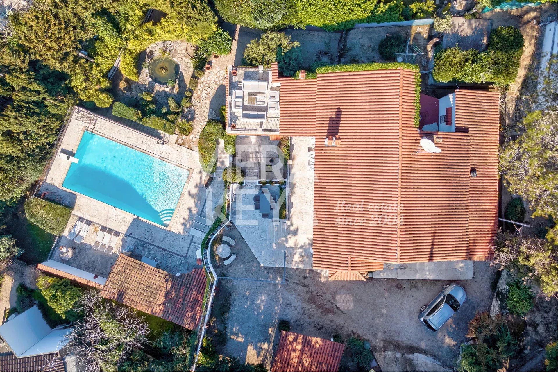 MOUGINS: Elegant villa med 5 sovrum, fri utsikt och pool Magnifik villa med 207 m² boyta, belägen i en grönskande och fridfull omgivning, med generösa utrymmen och förfinade materialval. I perfekt skick består den av ett rymligt och ljust vardagsrum med en elegant öppen spis, ett öppet kök, 3