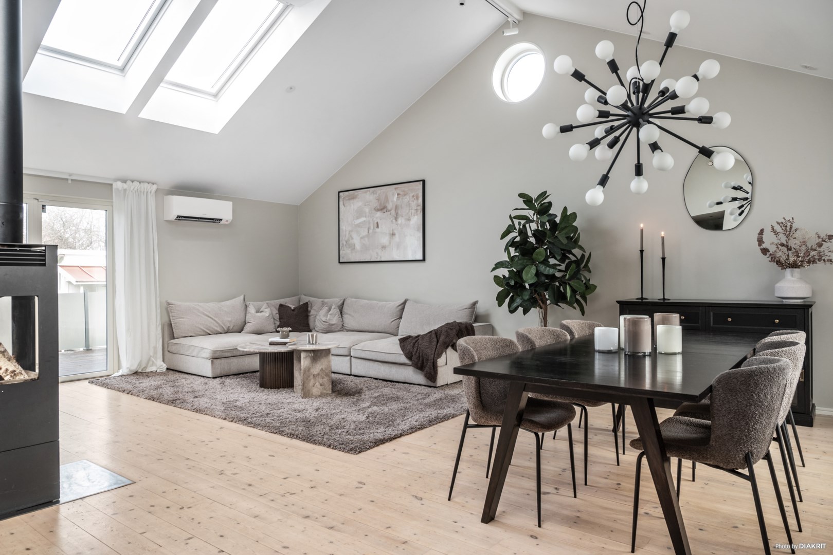 Välkommen till Glimmergatan 123, ett stilrent enplanshus som utstrålar ljus skandinavisk elegans. Denna fastighet erbjuder en välplanerad yta om 5 rum och kök, där vardagsrummet och köket smälter samman i en mycket rymlig öppen planlösning. Ryggåstak och takfönster skapar en ljus och luftig
