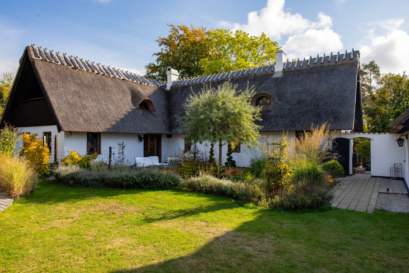 Skånevilla Stråtak Inrett annex Braskamin Qvesarumkök Vinkyl - 180 cm Gasspis - SMEG Smidestrappa fr. England Tegelgolv - Qvesarum Vinrum - 450 flaskor Synliga takbjälkar Fönster i Teak Walk-in closet Omsorgsfullt renoverad Fantastisk trädgård Blodröd bokhäck Utekök & bar Bubbel-spa