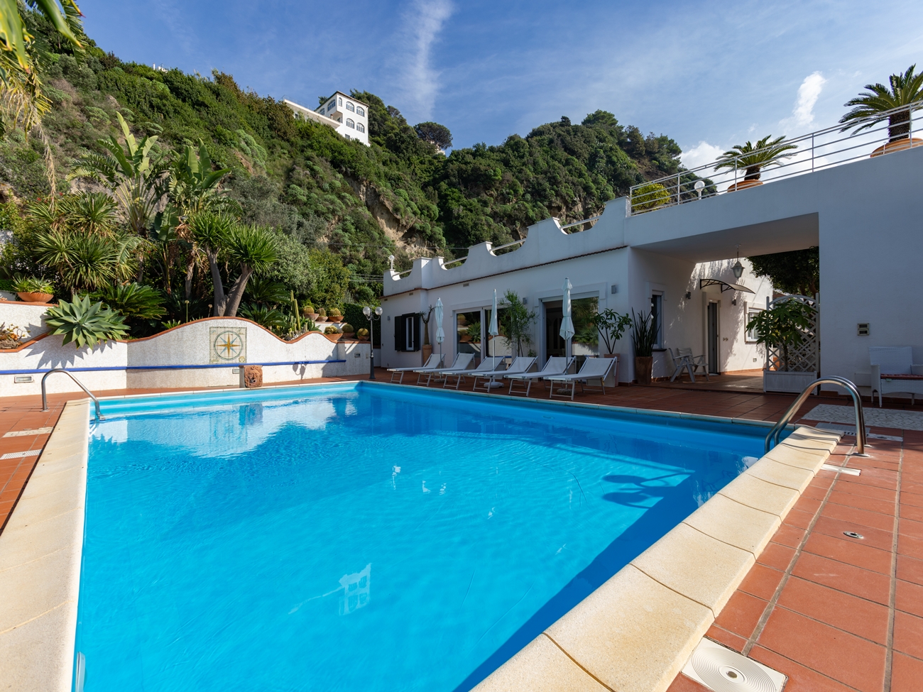 Svenskägd påkostad villa med pool och med gästhus perfekt för B&B verksamhet till salu i Forio på vackra ön Ischia vid Neapels havsbukt. Direktfärjor från och till Neapel i hamnen endast 1 200 meters promenad bort. Vacker sandstrand 1 000 meter bort. Vackra solnedgångar på denna sida av ön. Praktisk
