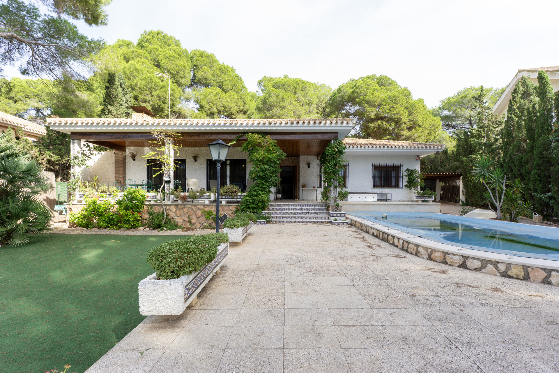 Vi är glada att kunna presentera denna magnifika traditionella spanska villa, belägen i det mest prestigefyllda området i Dehesa de Campoamor, Orihuela Costa – endast en kort promenad från stranden. Det oslagbara läget gör att du kan höra vågorna om natten och erbjuder en unikt rofylld