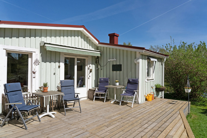 Attraktivt belägen 50-talsvilla i högt, fritt läge med solbelyst altan i söderläge. Villan disponerar totalt 187 kvm med stor utvecklingspotential i ett av öns mest eftertraktade lägen. Fin och funktionell planlösning med privata rum på entréplan och sociala ytor en trappa upp med direkt anslutning