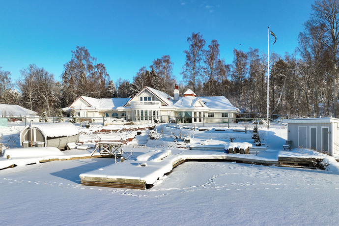 Sjötomt med ca 25 m strandlinje belägen vid Mälaren med pool och egen brygganläggning med separat bastu. Inrett gästhus i anslutning med utsikt över vattnet. Villan har en boa på 236 kvm och har energieffektiviserats med nya solpaneler på taket och luftvärmepump i vardagsrum och på övre plan och det