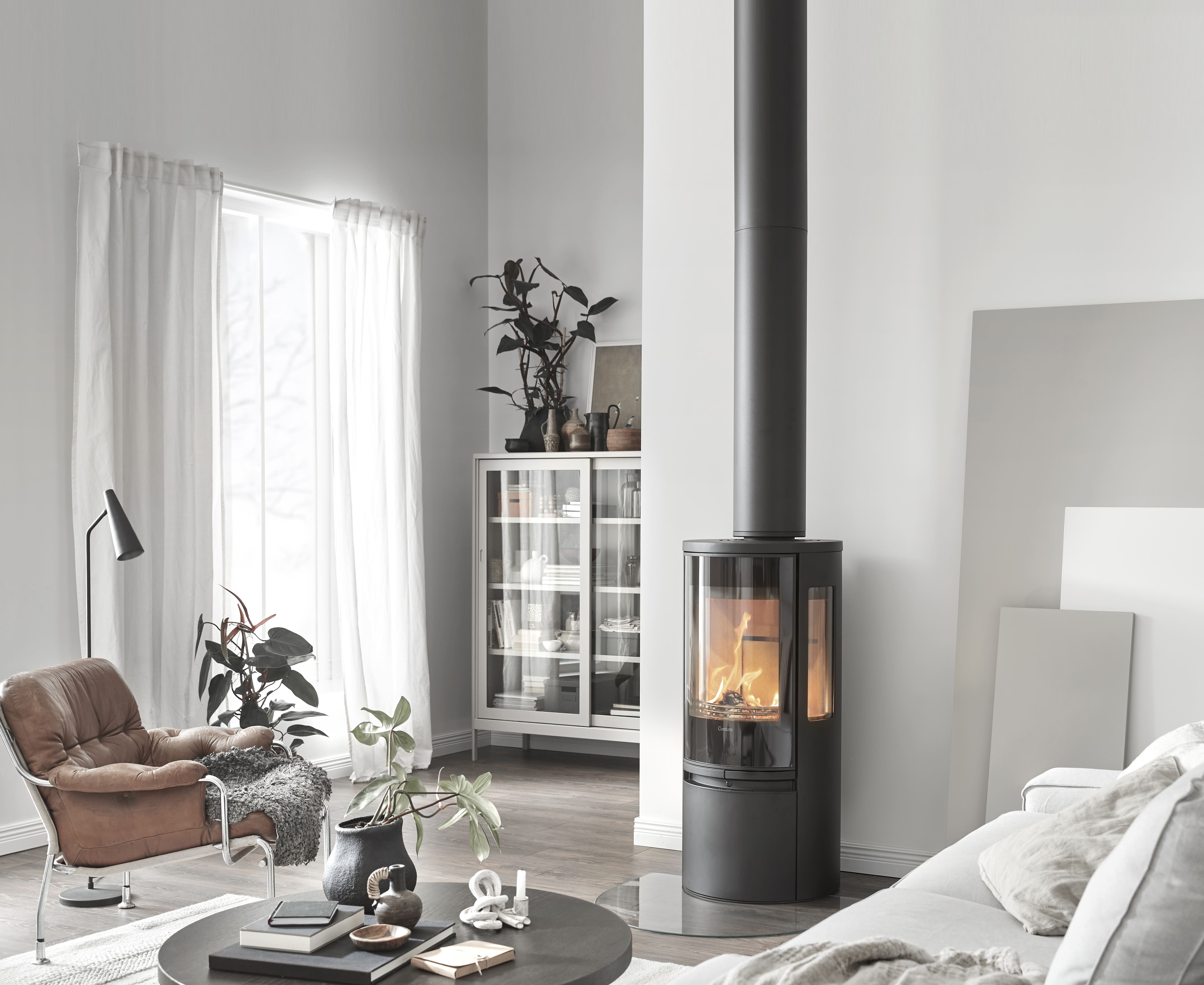 – Verkningsgraden är ett mått på hur många procent av veden som blir energi som stannar i rummet. Hög verkningsgrad är lika med små partikelutsläpp som är lika med bra miljöval. Modellen Conturas 600-serie, som är en kamin med upp till 9 kilowatts effekt och fantastiska 86 procents verkningsgrad, är en av de bästa på marknaden just nu. Med den eldar du inte för kråkorna, säger Jonny med ett skratt.