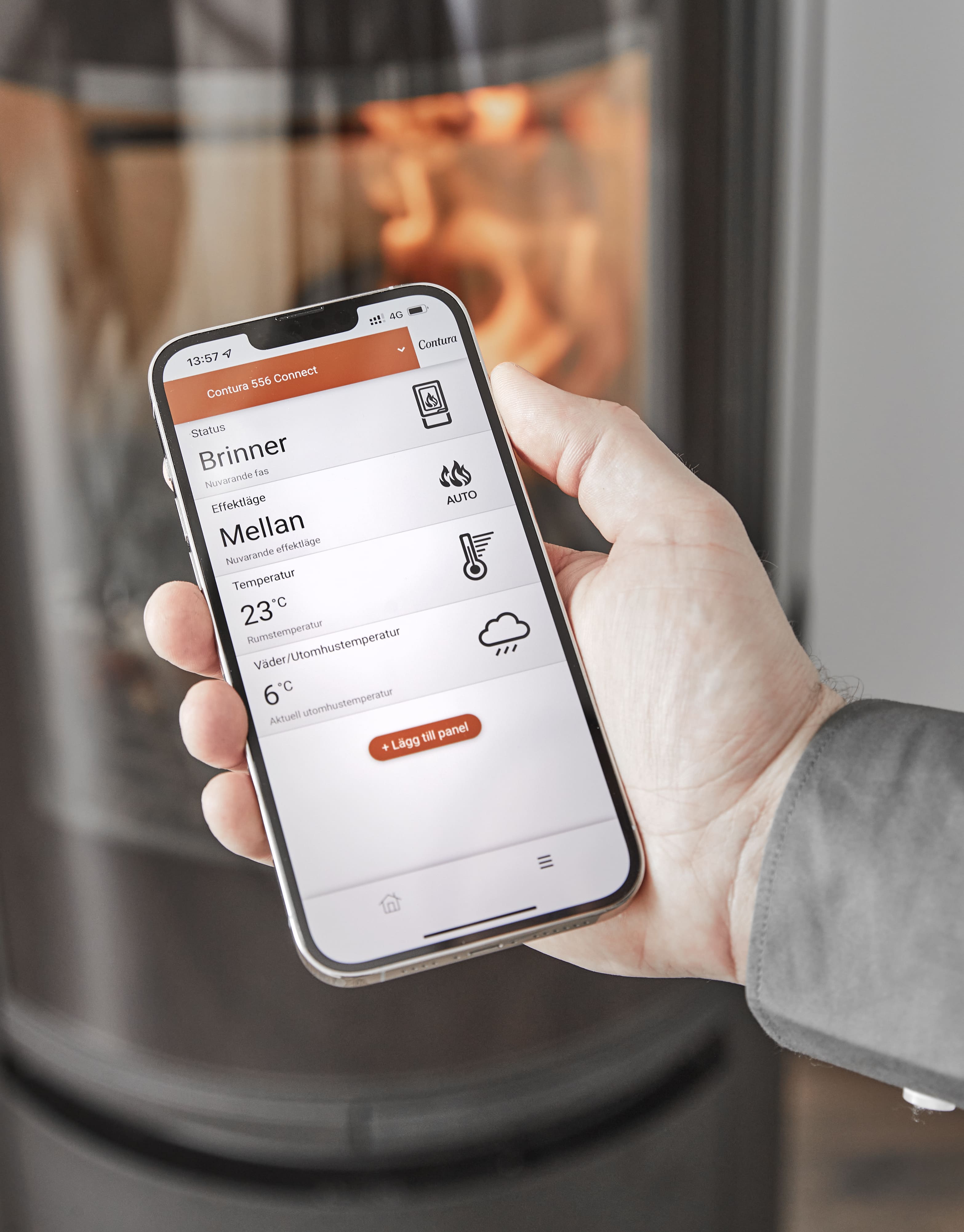 – Det finns en modell som heter Contura Connect och med den kan du ställa in och automatiskt reglera värmeeffekten,få data över hur mycket värmeenergi kaminen tillför huset och, ja även en notis om när det är dags att lägga i mer ved.