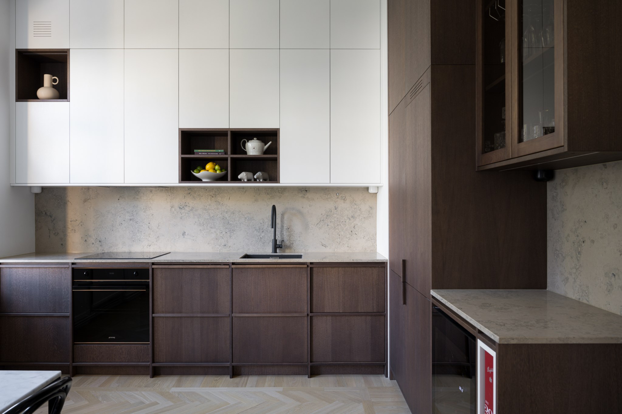 Det stora platsbyggda köket är minimalistiskt utformat och exklusivt inrett med luckor i vitt, valnöt och vitrin med förvaring ända upp till taket. Här får du dessutom bänkskivor och stänkskydd i kalksten, komplett maskinell utrustning och plats för ett större matbord för 6-8 personer på köpet. Vägg i vägg med köket finns ett stort vardagsrum med kakelugn och plats för både soffgrupp och matbord. Tre fönstersektioner i bredd ger gott om ljus och utsikt över Birger Jarlsgatans grönskande och stenlagda gator.