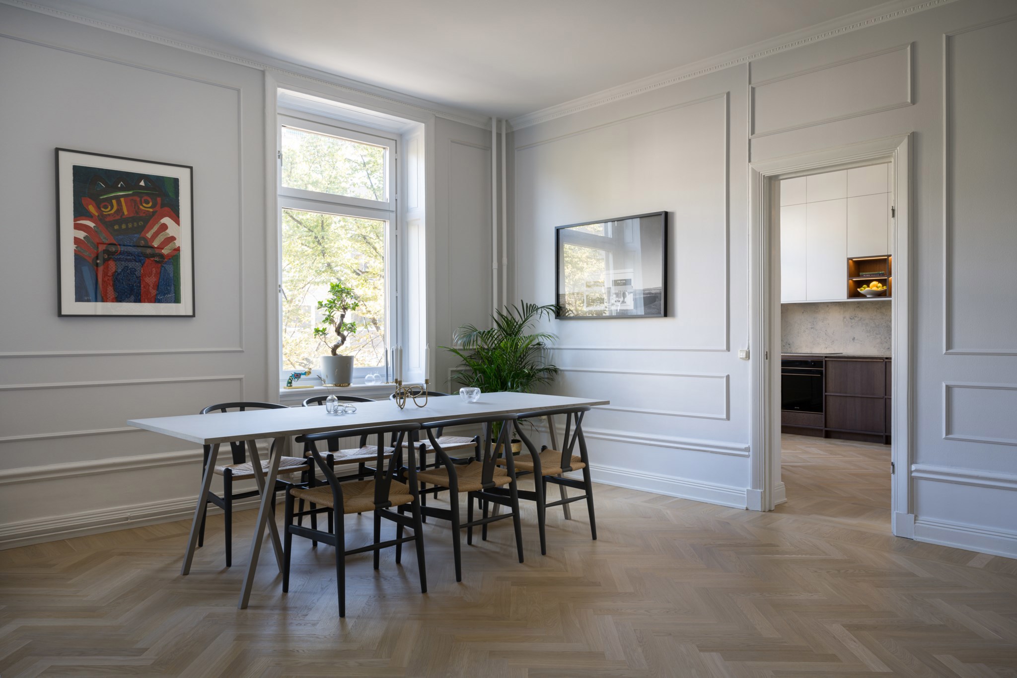 Våningen har nyligen renoverats smakfullt med stil, design, bra materialval, sobert färgsatta ytor och optimerade förvaringslösningar. Allt i symbios med detaljer i sekelskiftesstil såsom högt i tak med stuckatur, paneler, väggfält och höga socklar, fiskbensparkett i ek, spegelvända och glasade dörrar, höga fönstersektioner med speglade nischer och en kakelugn.