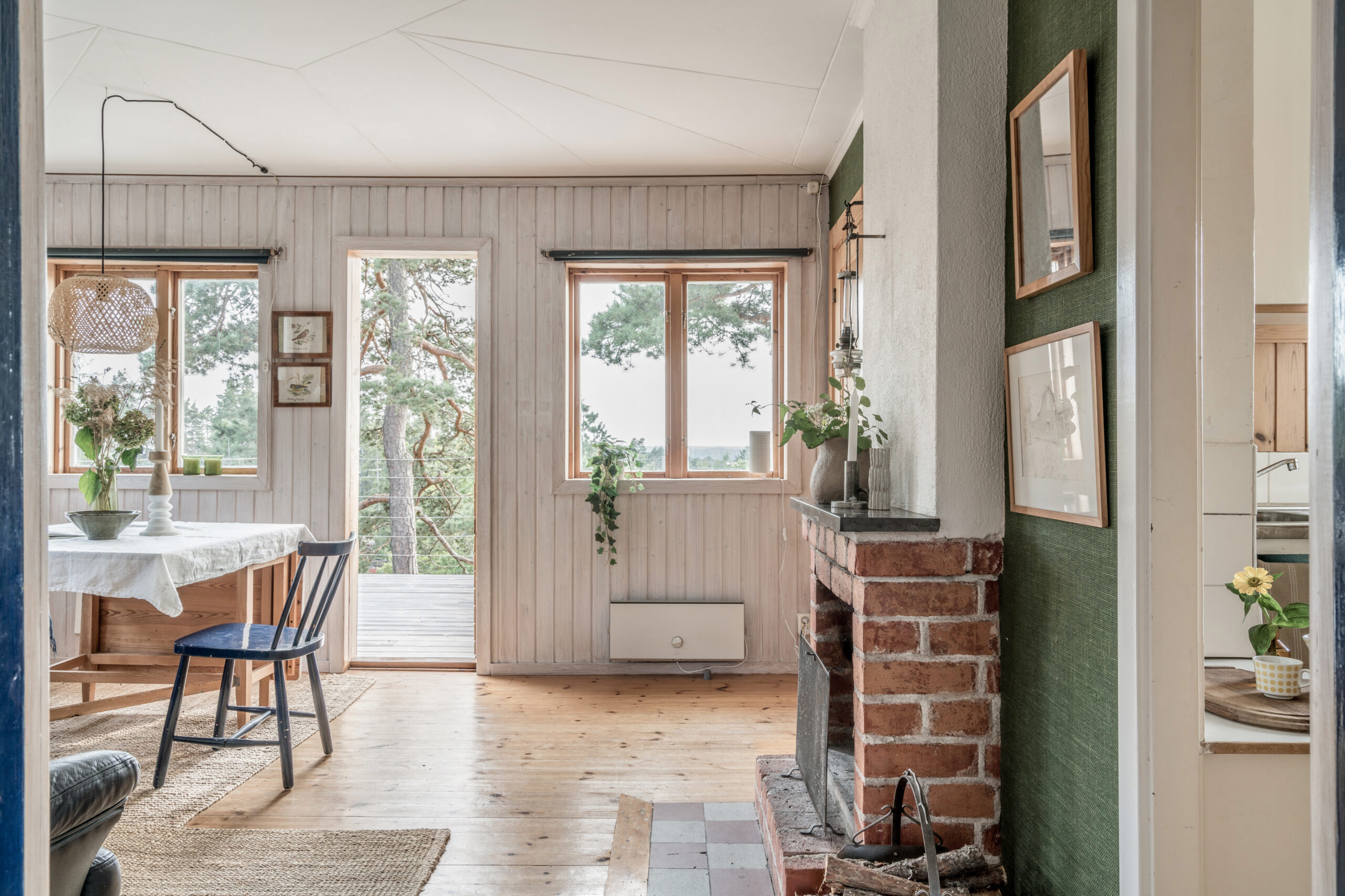 - Allrum med öppen spis och utgång till altan. Trägolv och panel på väggarna, med en grön vävtapet som fond vid öppen spis