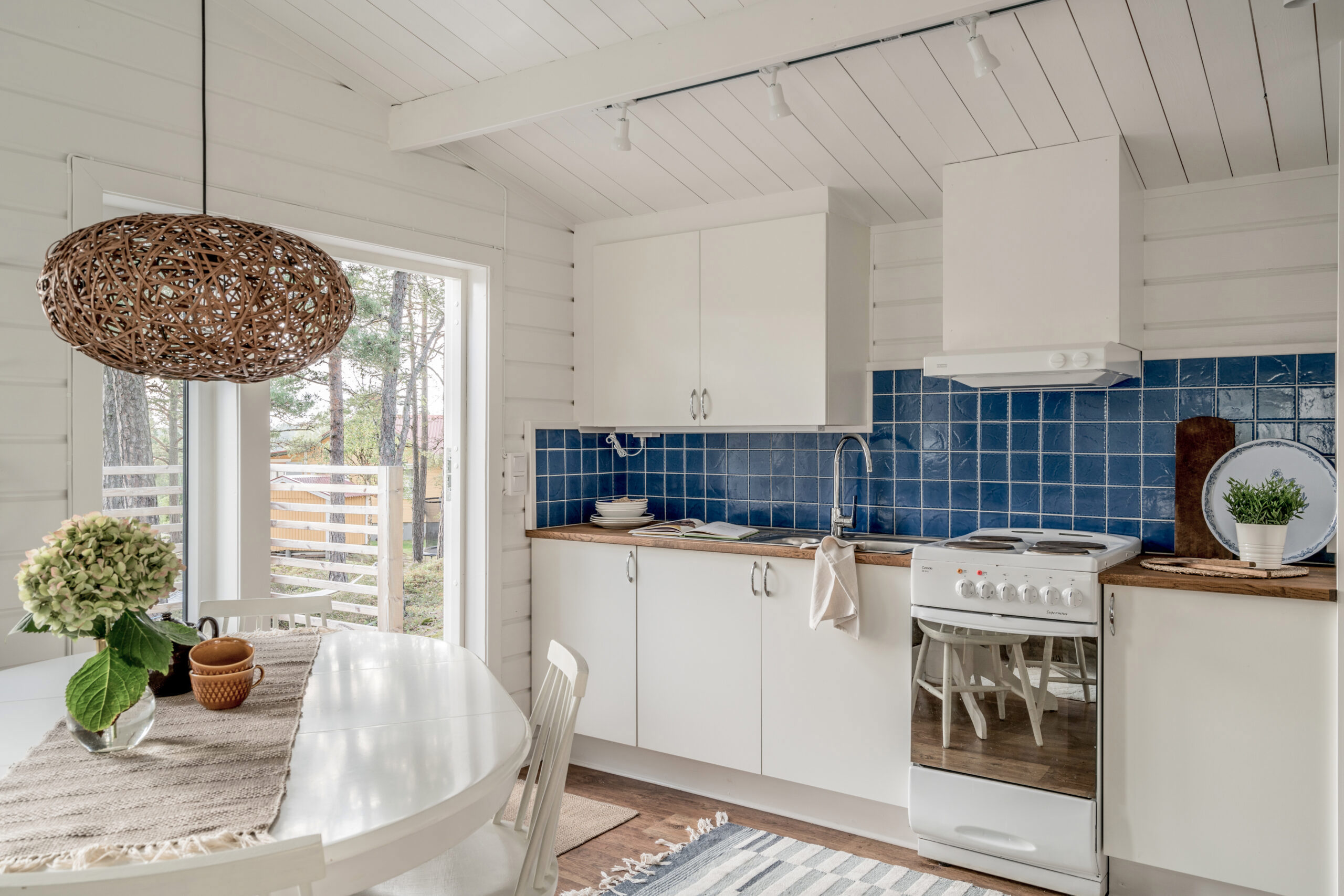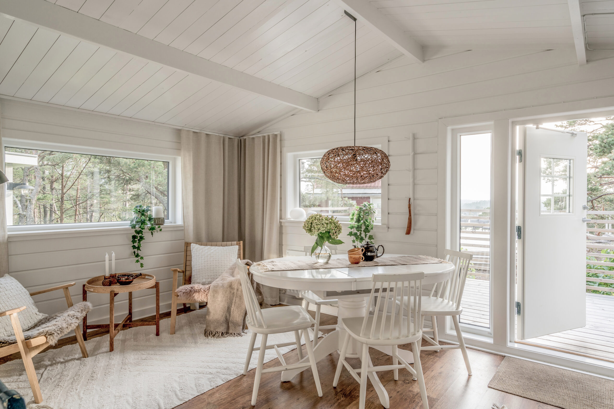- Kök och allrum i öppen planlösning med entré och utgång till altan. Laminatgolv och vitmålad panel på väggarna och i taket (öppet upp till nocken)