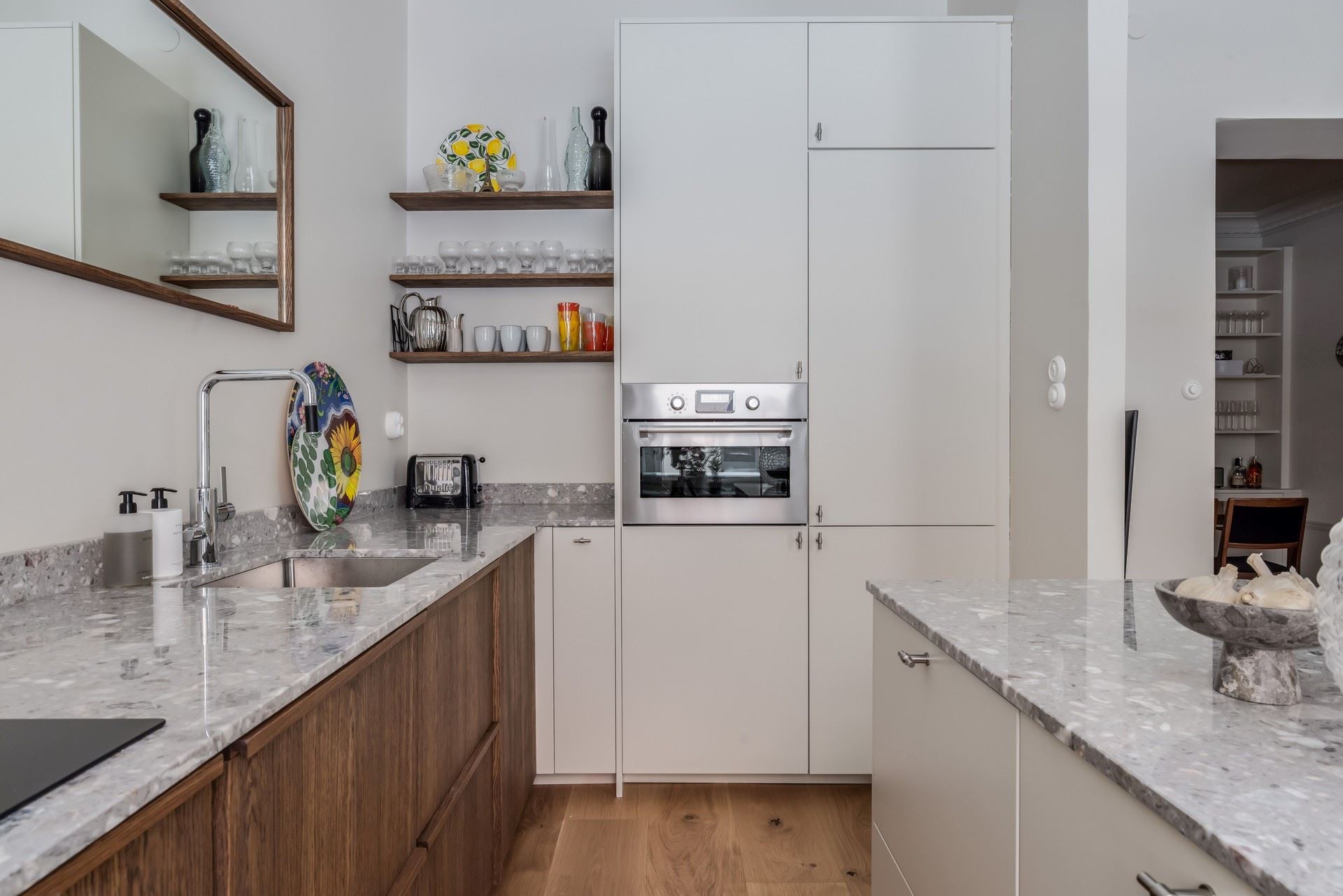 Under 2022 genomgick lägenheten en omfattande renovering där kök och sovrum bytte plats för att skapa en öppen planlösning mellan köket, vardagsrummet och matsalen. Idag är lägenheten en perfekt oas för dig som är hemmakär och uppskattar luftiga, sociala ytor för släktmiddagar och familjefik.