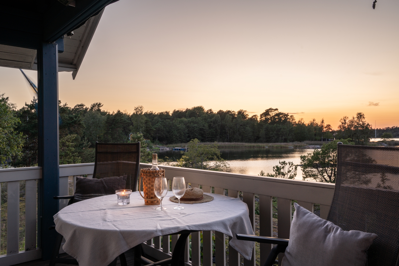 På nedre våningen finns ett ljust kök, mysigt vardagsrum och sovrum med takhöjd upp till nock med takbjälkar. På ovanvåningen finns ett stort sovrum samt balkong med en fantastisk utsikt över skärgården.