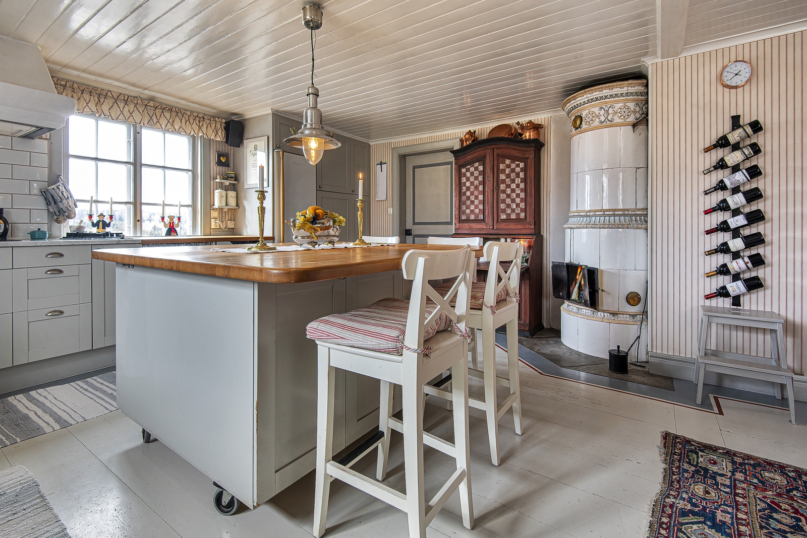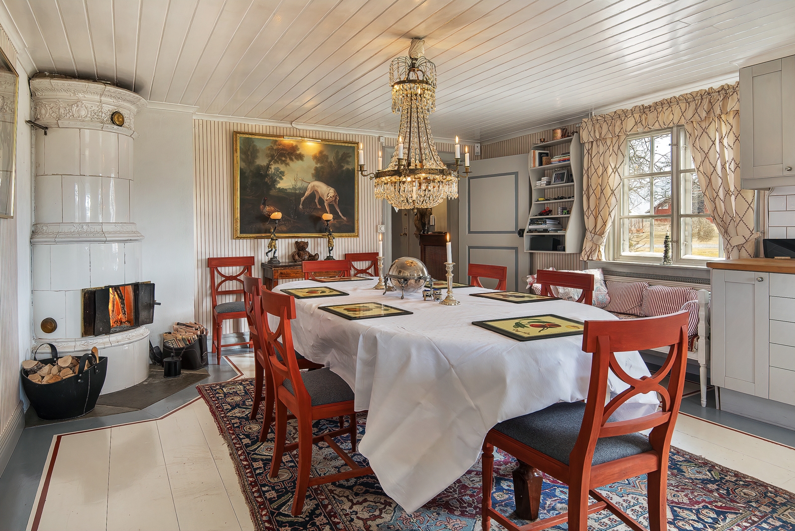 Väl inne i det rymliga huset finns det gott om möjlighet till mysiga höstkvällar med familj och vänner då huset har flera vackra och fungerande kakelugnar och fina uppmurade eldstäder.