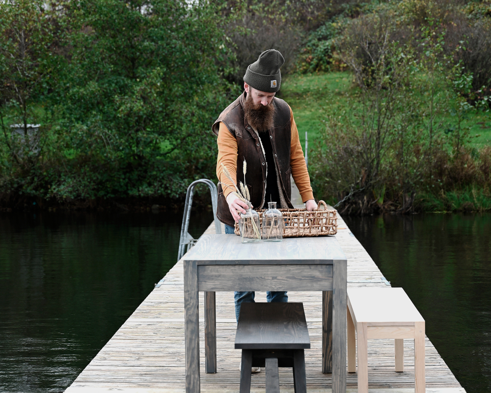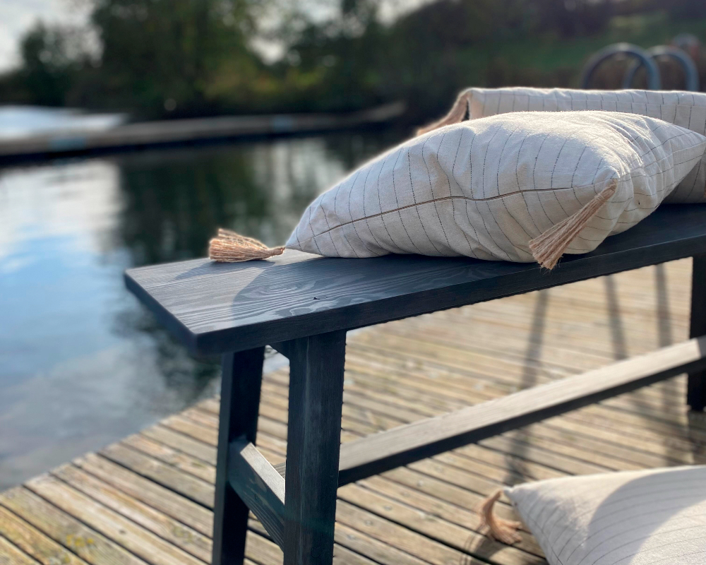 – Vi har etablerat ett samarbete med Ottosson Färgmakeri, som är experter på linolja, som är ett miljövänligt material från de vackra fälten med linblommor. Det används som bas i mönjan för att skydda vissa smidesprodukter, samt för lasyrer och vaxningar som skyddar träet. Genom att använda järnmönja ger det kunden möjligheten att välja om utebänken ska få ett rostskydd eller en vacker patina, vilket gör att det blir lika vackert oavsett om det är inne eller ute. Material som trä och smide är helt perfekt för båda användningsområdena.